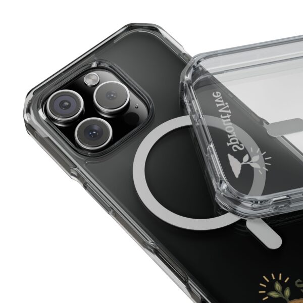 A slim, crystal-clear phone case that keeps your phone’s lines visible while adding subtle protection and modern function. The transparent polycarbonate back and TPU sides let your device’s color show through, while a MagSafe-compatible embedded magnet ring snaps on to chargers and accessories without fuss. Air-cushioned bumper corners absorb knocks and drops, and precise cutouts let you attach straps or charms. Bright, detailed printing options mean you can add vibrant art that won’t look washed out beneath the clear finish. Lightweight and understated, this case blends everyday practicality with a touch of personality.